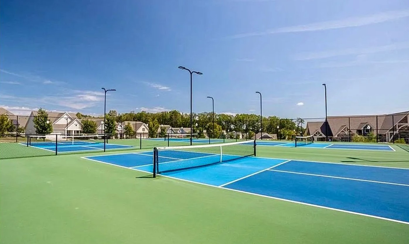 Hickory Bluffs amenities include pickleball courts, tennis courts, a resort-style swimming pool, clubhouse, fitness center, and planned social events, with lawn maintenance included.