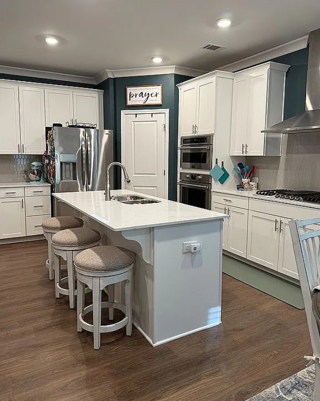 This 1 1/2 story home features two living areas, a formal dining area that can also serve as a home office, and a chef’s kitchen with stainless steel appliances and a custom pantry storage system.