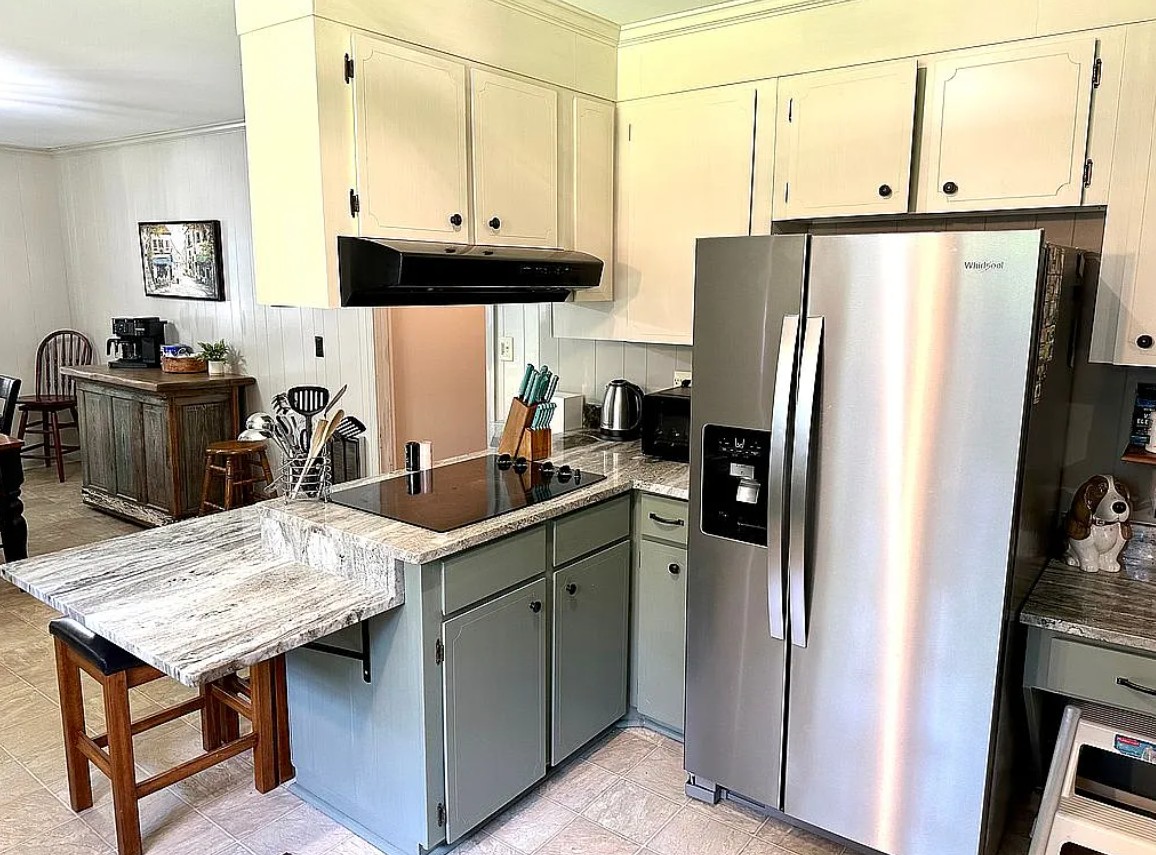 The kitchen includes a stainless steel refrigerator, completing the blend of vintage appeal and modern convenience.