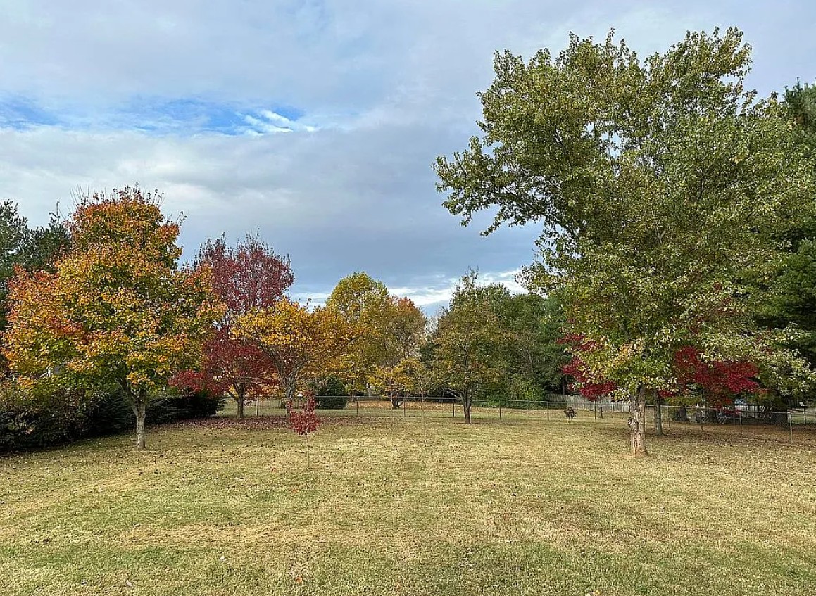 Beautiful all-brick 3 bedroom, 2-bath single-family ranch for sale by owner in Rockvale, TN, featuring a covered back porch and a large fenced yard with flowering shade trees and vibrant fall foliage.