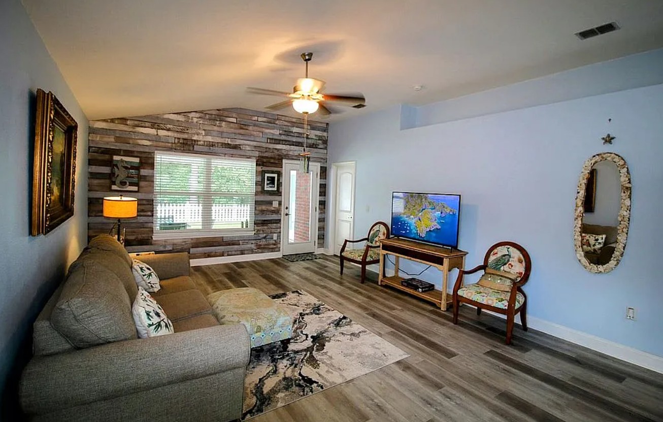 The expansive living room opens to a spacious rear patio, perfect for relaxing or hosting guests.