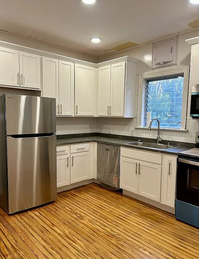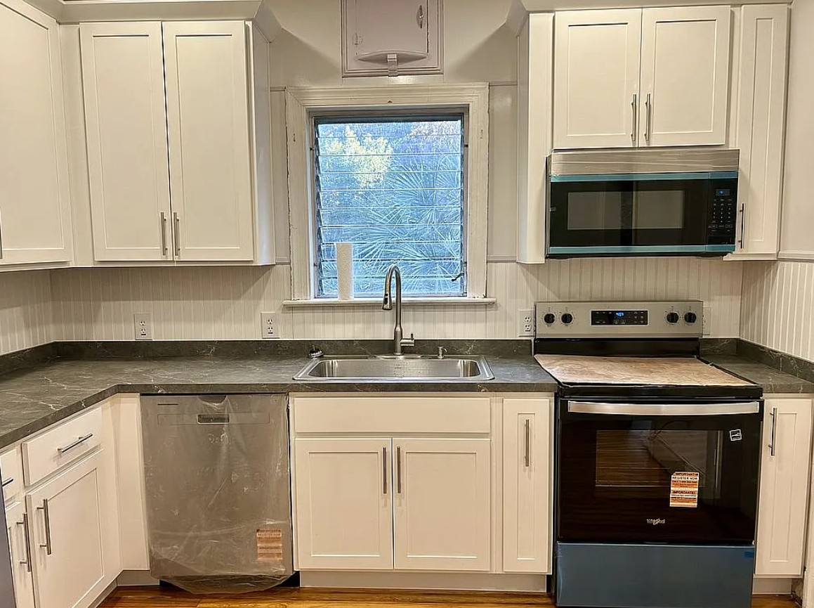 The updated kitchen includes white shaker-style cabinetry and new stainless steel appliances, creating a clean, modern look.