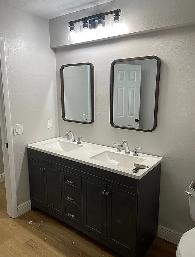 Both bathrooms were fully remodeled from the ground up, showcasing new vanities, modern sinks, and high-end materials.