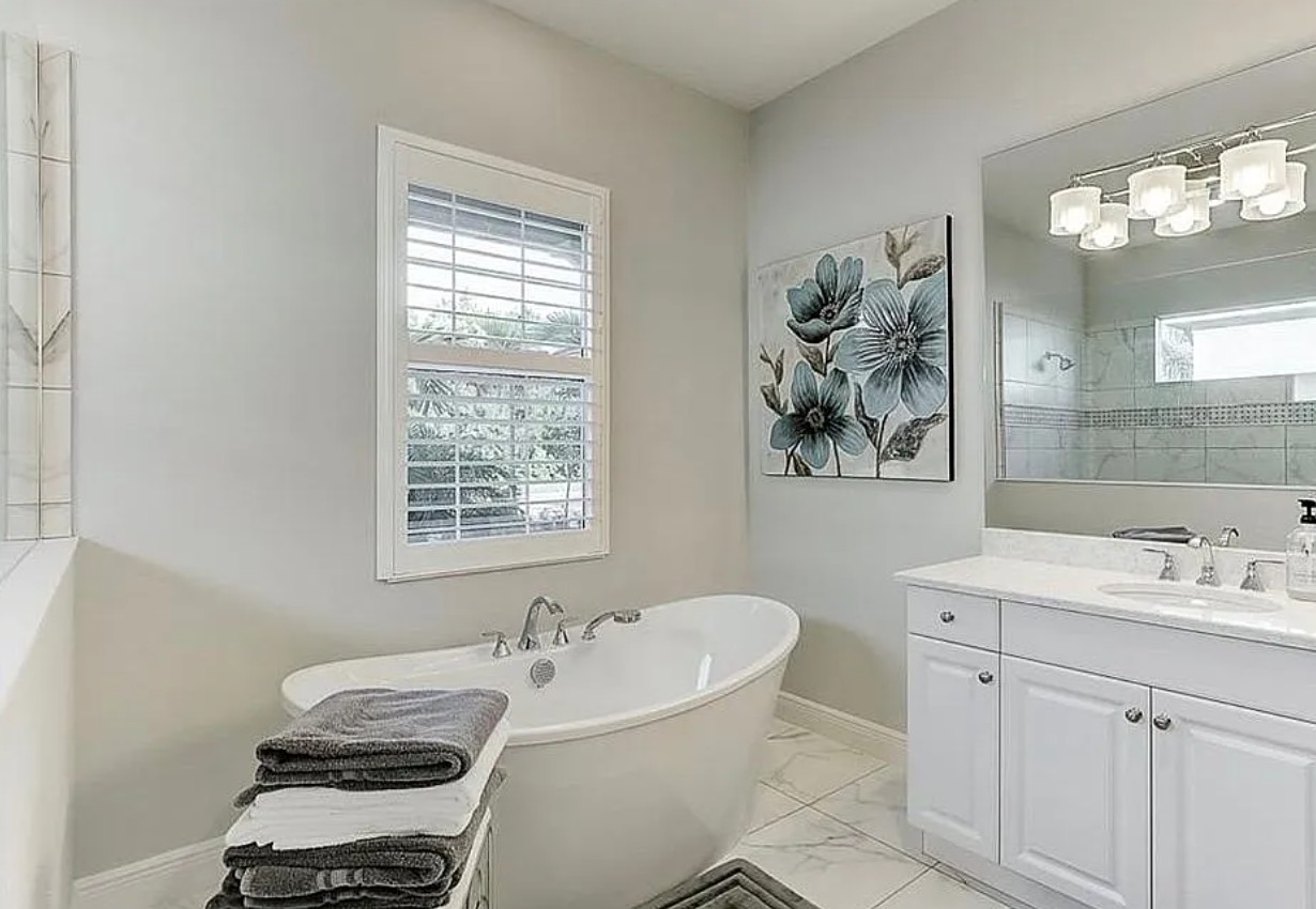 The primary suite offers peaceful water views, dual walk-in closets, and a spa-inspired en-suite bathroom with dual vanities, walk-in shower, and soaking tub.