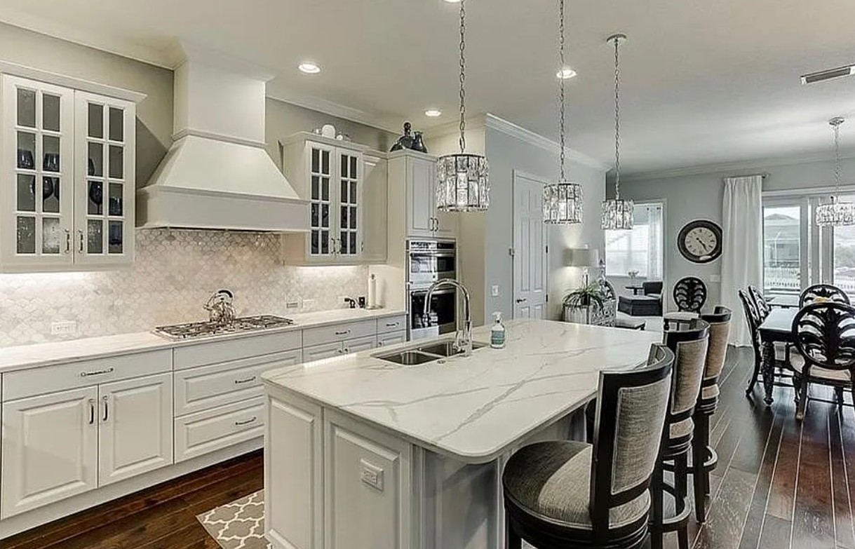 The chef’s kitchen features quartz countertops, a commercial-grade gas stove, double oven, Carrara marble backsplash, oversized island, and designer pendant lighting perfect for entertaining.