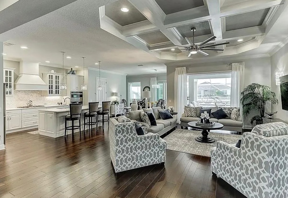 Inside, the open-concept floor plan is filled with natural light from large windows and sliding glass doors, seamlessly blending indoor and outdoor living.