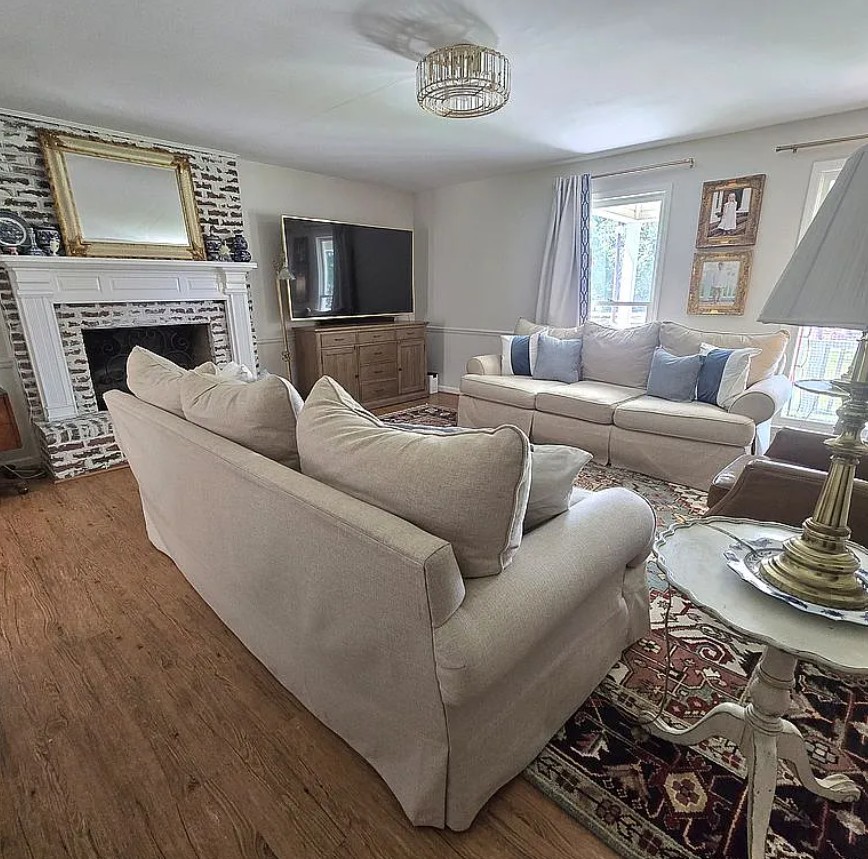 Enjoy outdoor living with two large porches and a screened in porch overlooking a new gunite swimming pool, perfect for relaxing or entertaining guests.