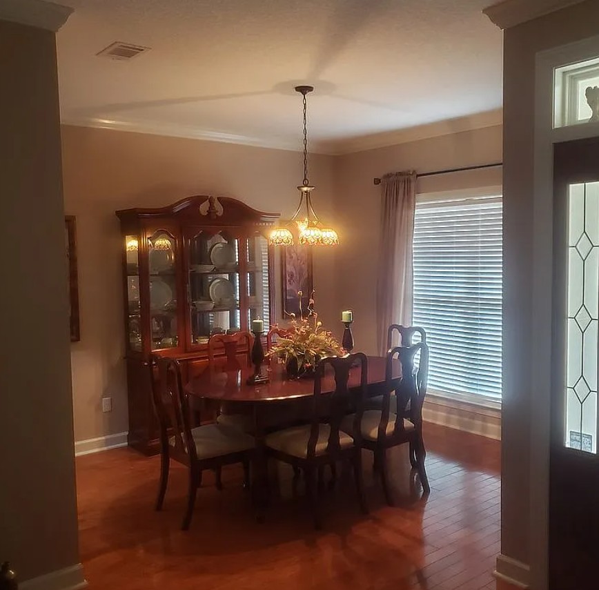 Adjacent to the kitchen is a beautiful formal dining room, complete with a hardwood table and china cabinet.