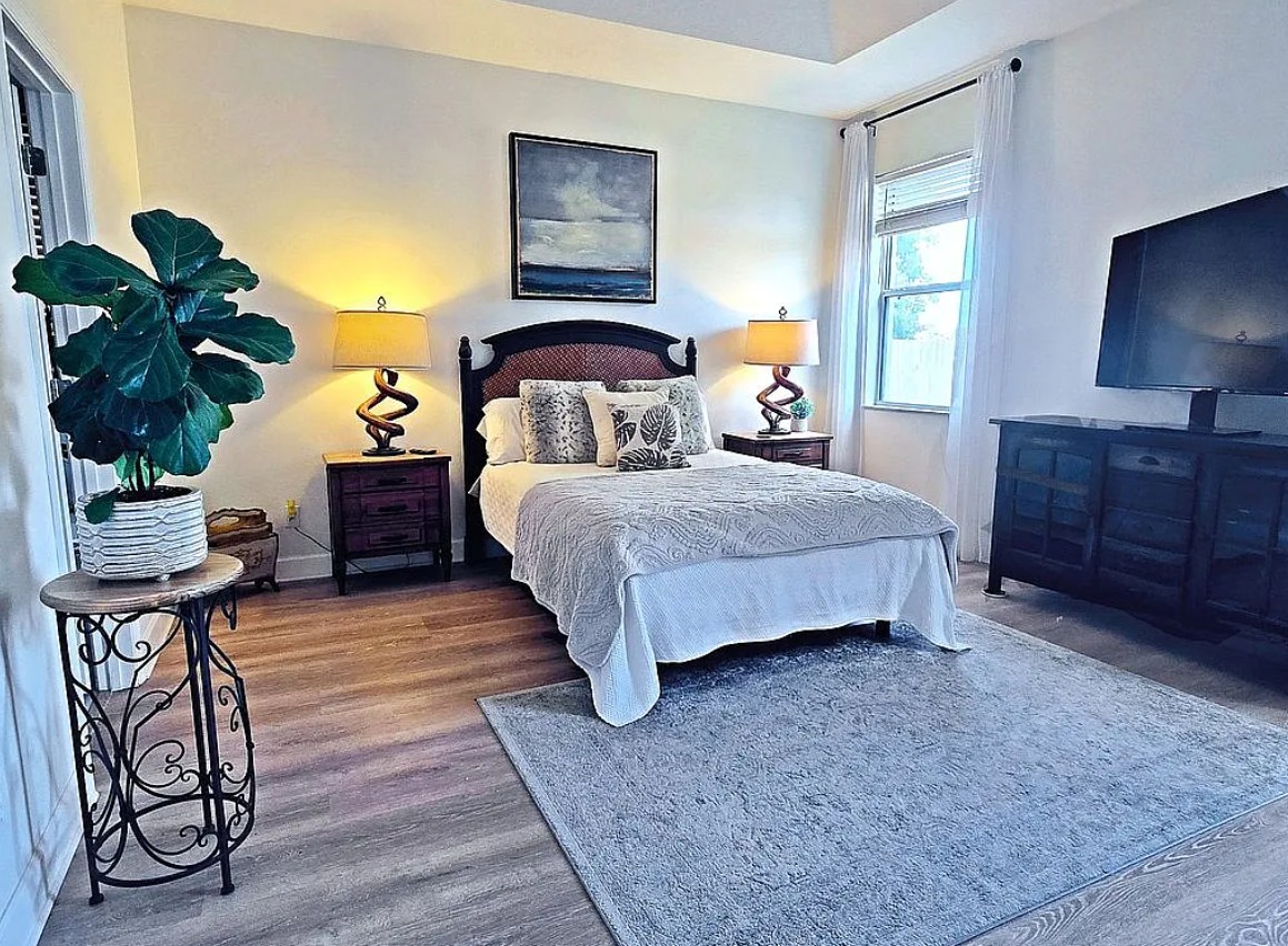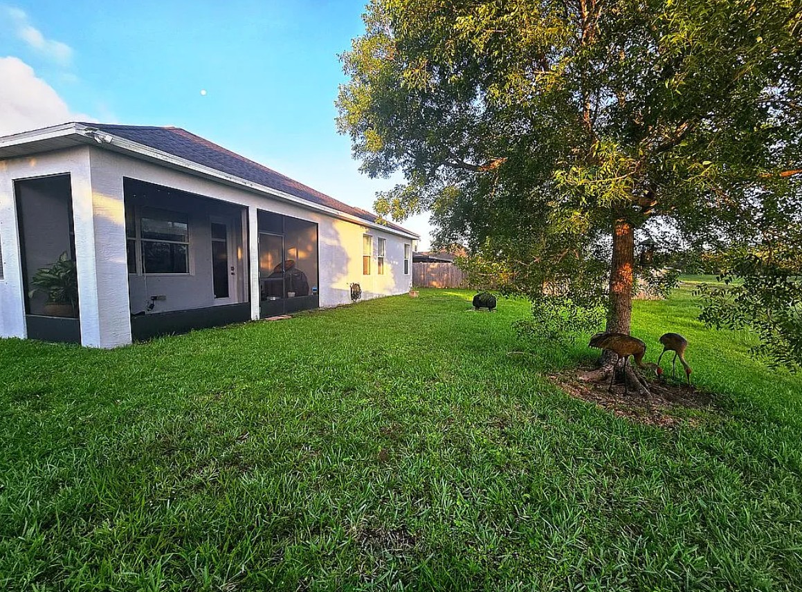 Step outside to the newly screened back patio (lanai) overlooking a wide water canal and peaceful greenway, where mature landscaping and Florida birdlife provide a serene backdrop for morning coffee or evening relaxation.