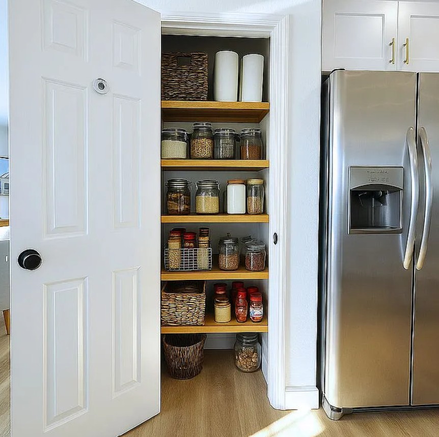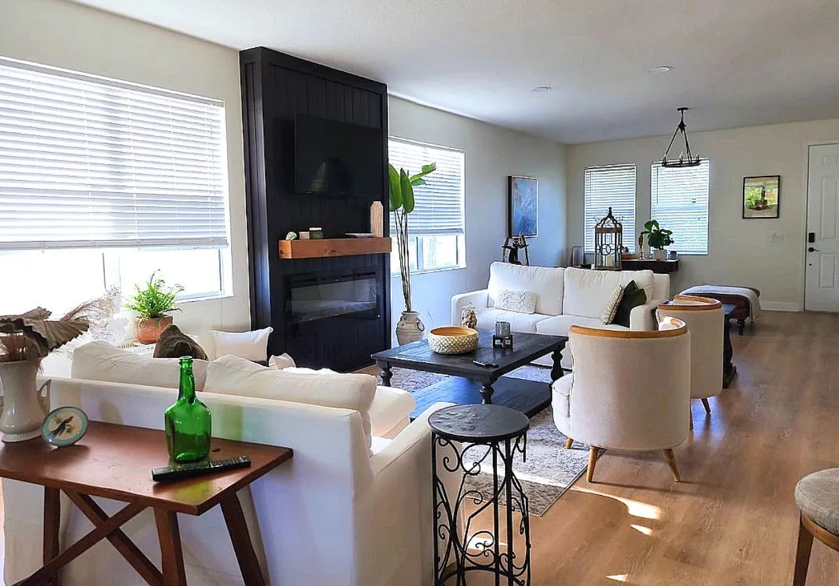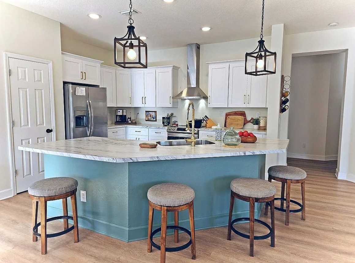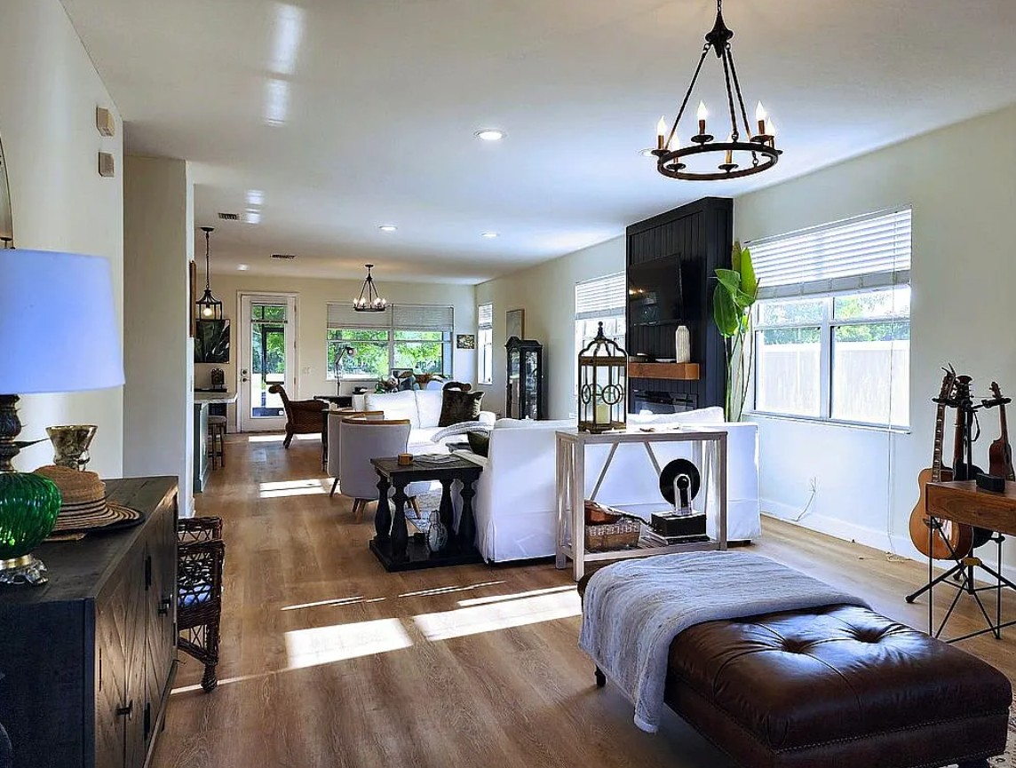 The updated kitchen showcases new shaker cabinets and opens seamlessly into the main living area, creating a connected space ideal for gatherings.