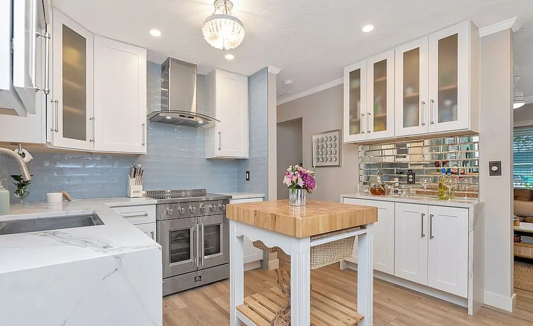 The luxury chef’s kitchen features waterfall “Gold Rush” quartz countertops, imported handcrafted floor-to-ceiling tile backsplash, 24-inch deep soft-close custom cabinetry, high-end appliances, and a built-in coffee and wine bar with antiqued mirror tile backsplash.