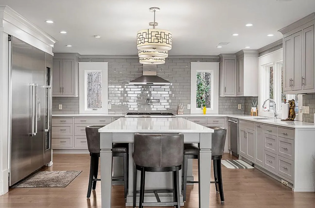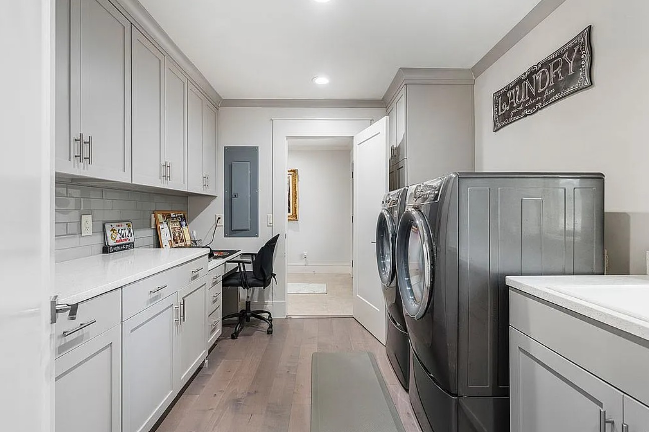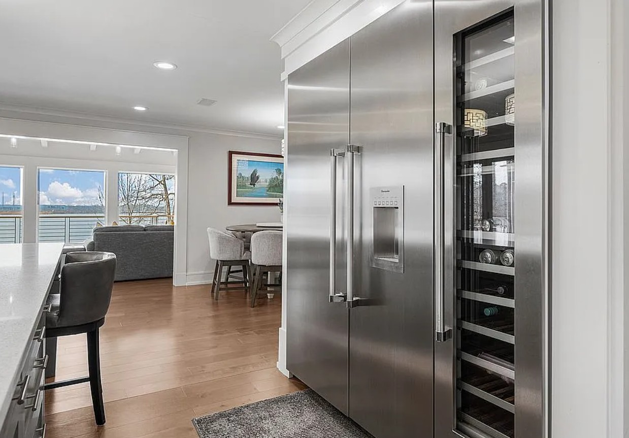 The chef’s kitchen is designed for both beauty and functionality, featuring mirrored Silestone countertops, a huge center island, and premium Thermador appliances, including a separate full-size refrigerator and freezer, wine cooler, six burner gas stove with griddle, oven, and steam oven.
