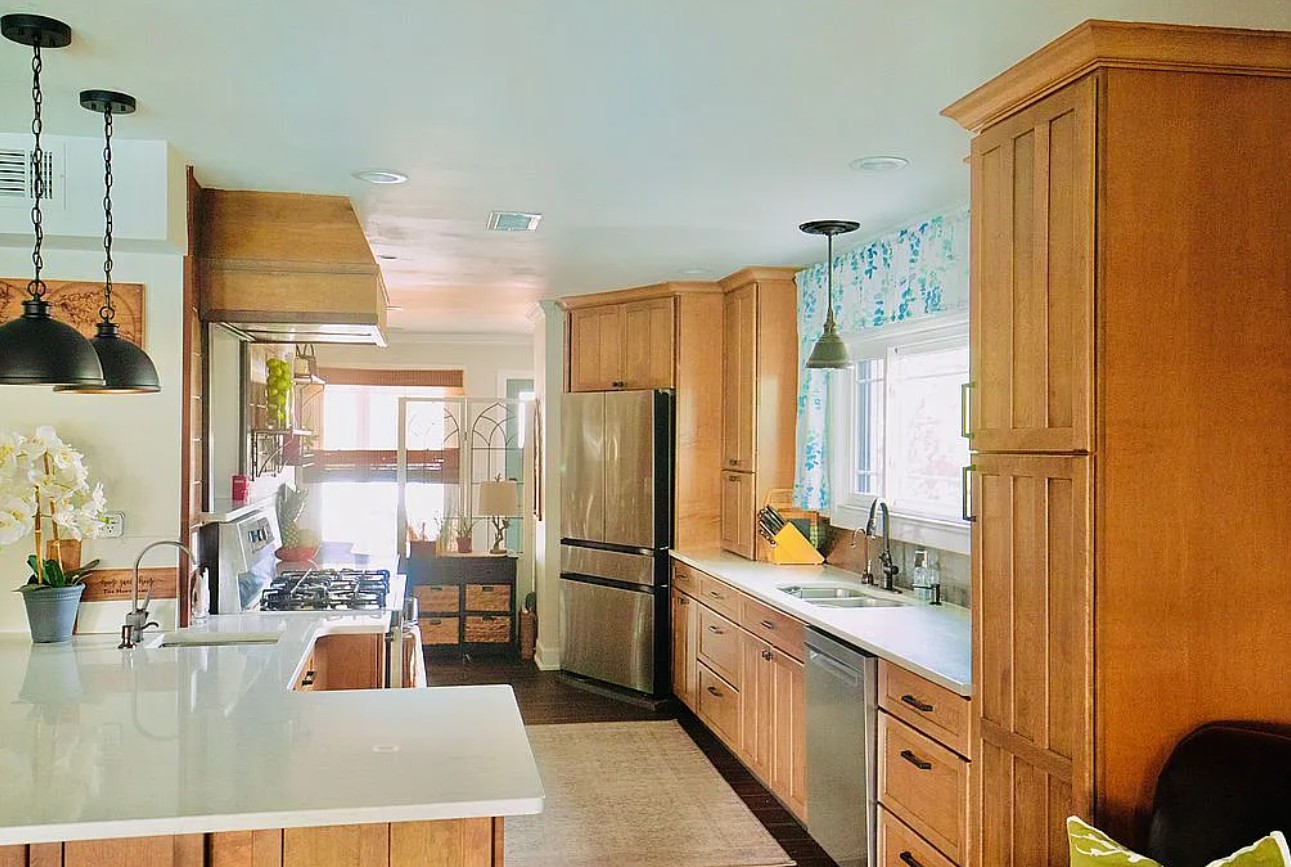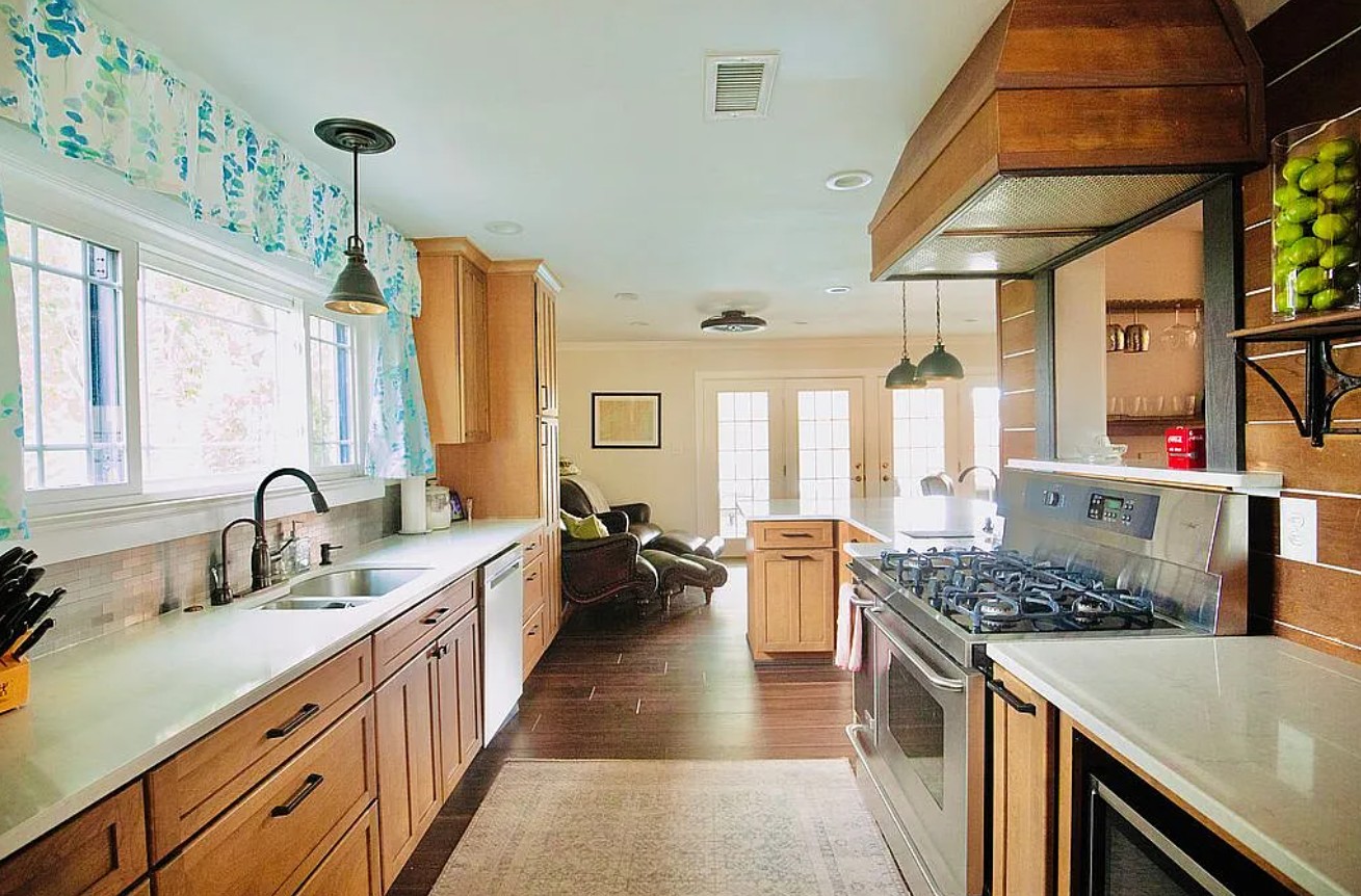 The updated kitchen includes craftsman cabinetry, a chef style stove, and modern appliances, perfect for everyday living and entertaining.