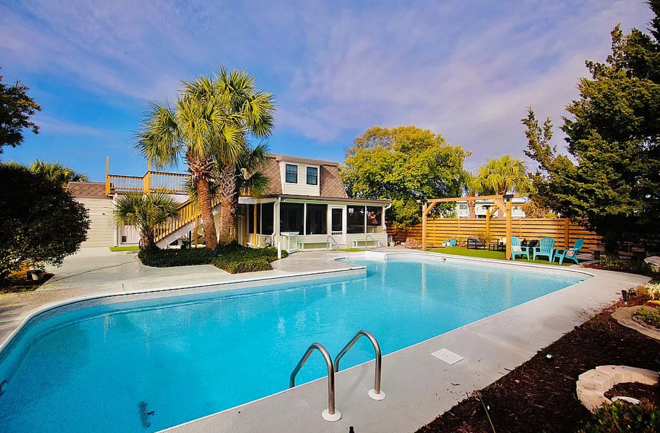 Step outside to your private backyard oasis, featuring a rare 42 foot swimming pool, screened porch, and a backyard pergola seating area ideal for relaxing or hosting guests.