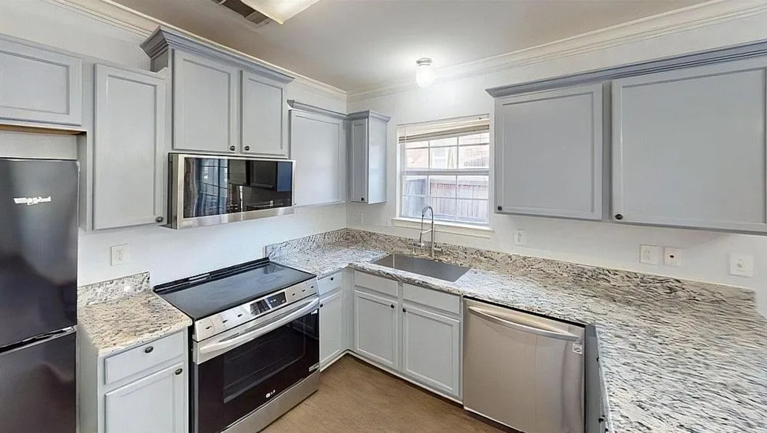The home features an upgraded kitchen with granite countertops, modern cabinetry, and updated appliances, along with modern fixtures throughout for a clean, contemporary feel.
