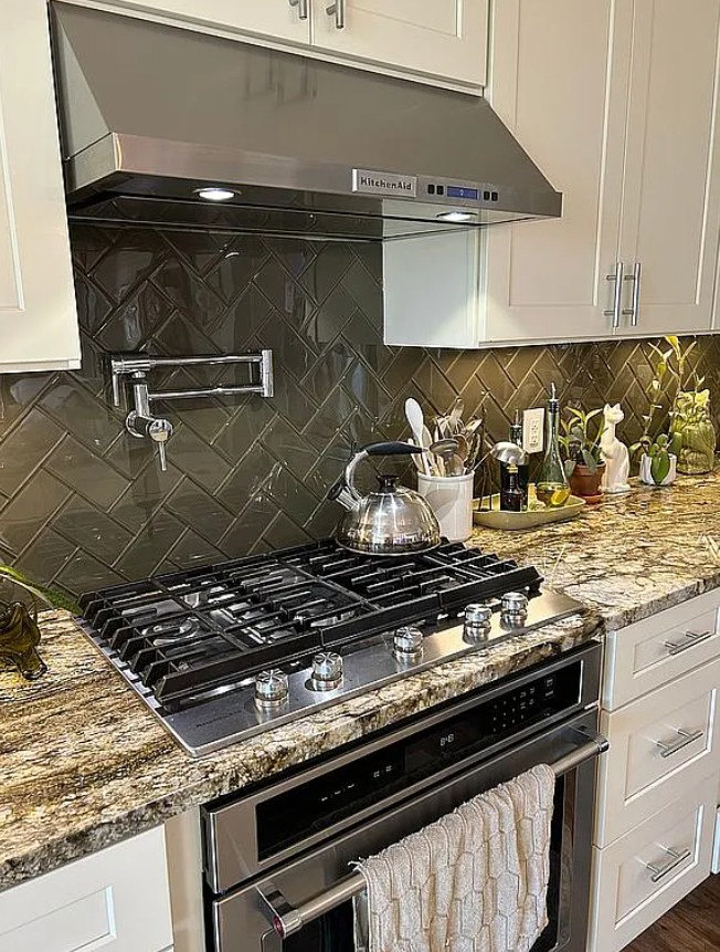 The fully equipped kitchen is a standout with premium KitchenAid appliances, a microwave drawer, gas stove with pot filler, and a glass tile herringbone backsplash, flowing seamlessly into a spacious living room with vaulted ceilings and a cozy gas fireplace.