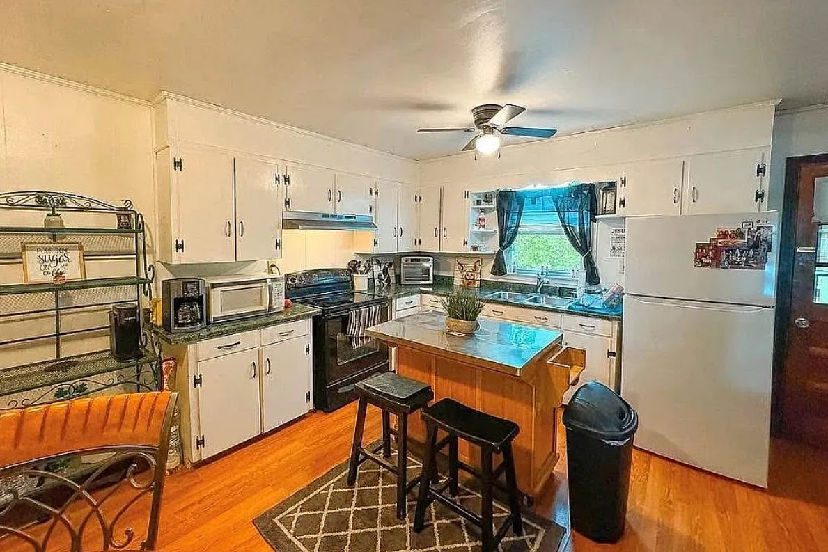 The kitchen comes equipped with a refrigerator and stove that stay with the home, while other rooms have been updated with new flooring and fresh paint.