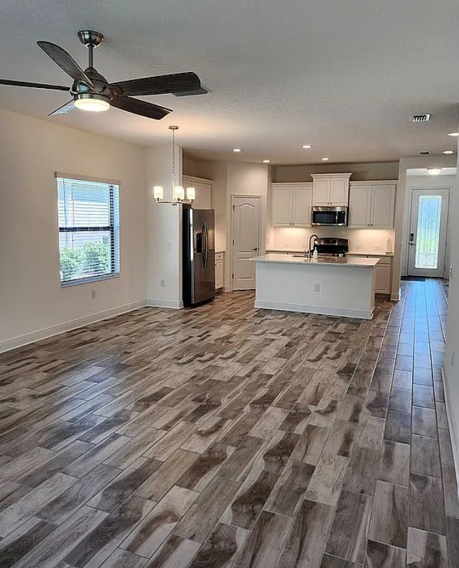 The property backs up to a private preserve and faces green space, offering added privacy, scenic views, and more space between neighboring homes than typical properties in the area.