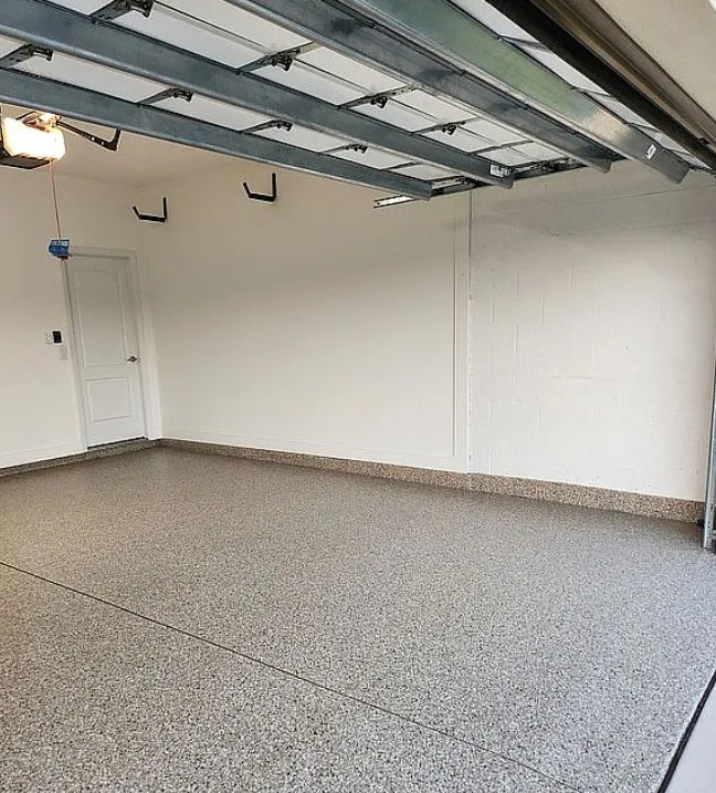 The spacious 2-car garage includes a newly installed epoxy floor, air conditioning, and pull-down attic access for additional storage.