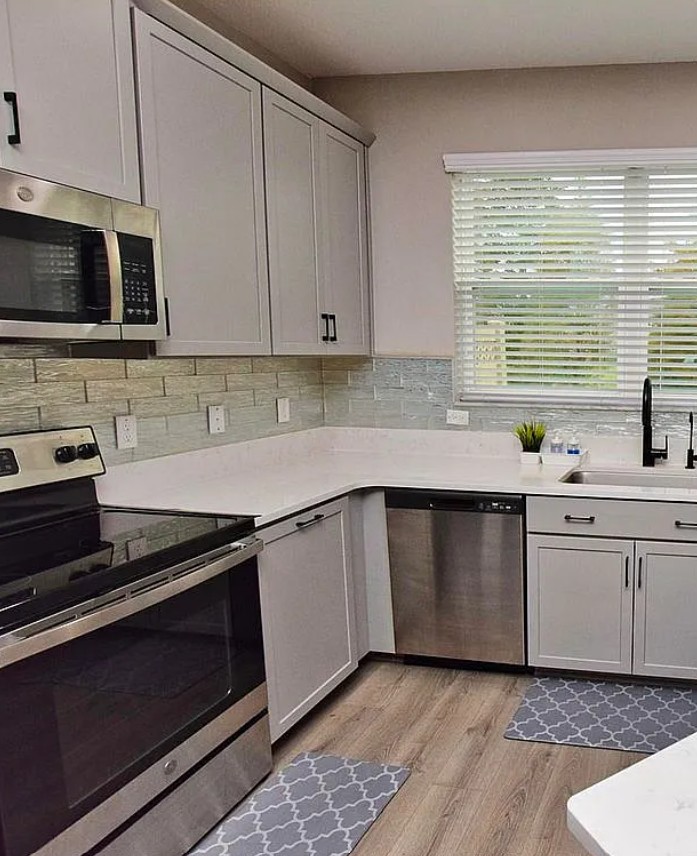 This Wesley Chapel FL townhome for sale includes a modern upgraded kitchen with a brand-new Samsung smart refrigerator featuring Family Hub touchscreen technology, a contemporary backsplash design, ample cabinetry, and generous counter space ideal for cooking and entertaining.