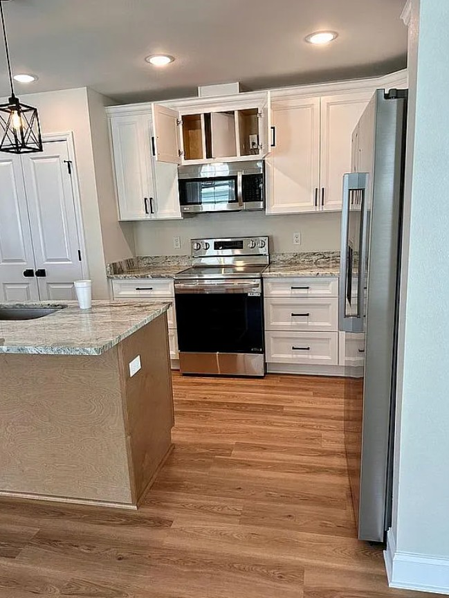 The open-concept layout features a bright living room connected to a stylish kitchen with a large center island, perfect for entertaining and everyday living.